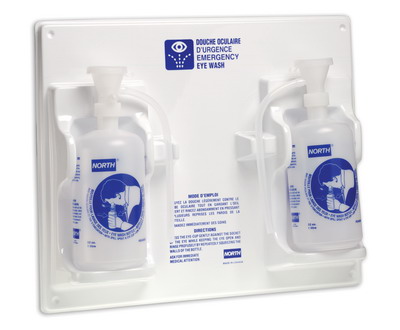 Estación lavaojos portátil de pared. Compuesta por dos botellas